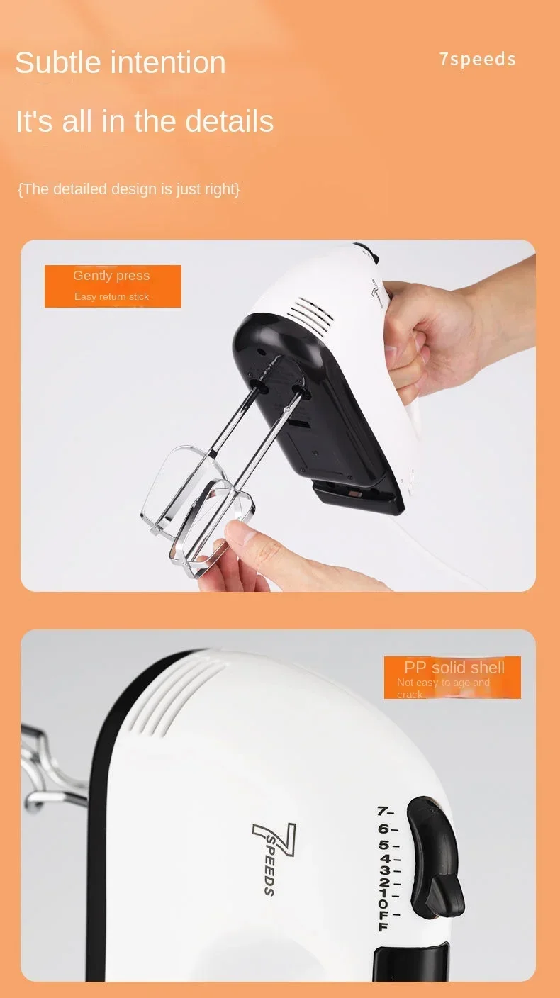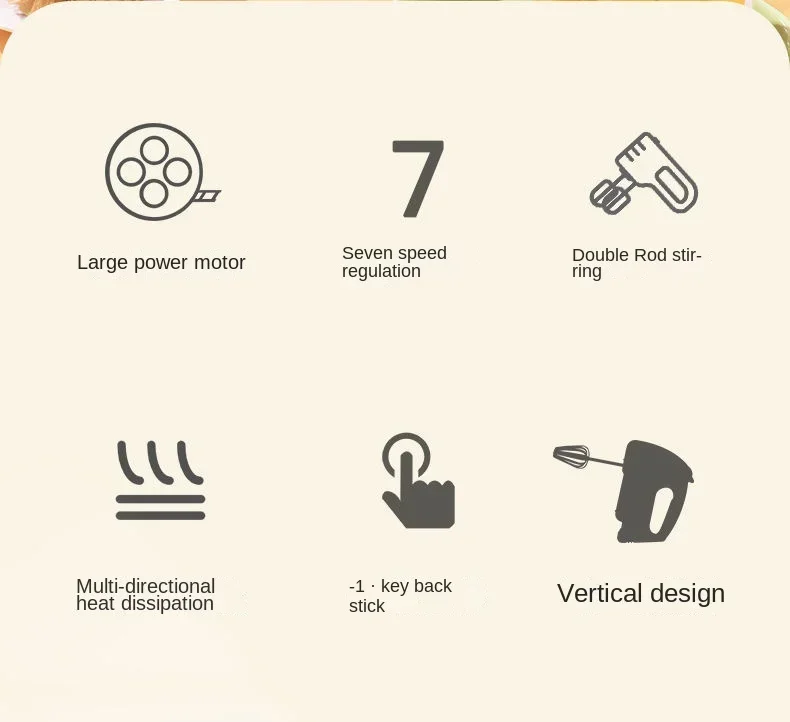 2.رؤوس خلط مزدوجة، وخطافات عجين، مريحة للخلط والعجن، مما يوفر الوقت والجهد.الخلاط ذو السلكين مناسب للكريمة المخفوقة الرقيقة، والتجميد المثالي، والكعك مع بياض البيض المخفوق.